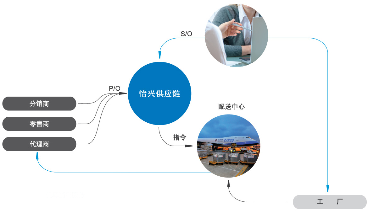 服务内容: 1)订单处理 2)垫付货款、垫付税金、代开L/C、对外付汇 3)进出口通关物流服务 4)境内仓储服务有怡兴供应链“协同”的企业,将在以下方面增强自身的优势竞争力: 1) 降低企业采购成本及人力投入成本; 2) 提高通关速度及采购执行效率,快速响应市场需求; 3) 在整个采购运作中成本降低,人力投入减少,有更多精力提升企业的核心竞争力。 4) 提高了物流的速度、资金流动率和库存周转率,从而降低了大量的流通成本和库存成本; 5) 简化了手续和谈判过程,减少人力的投入,从而为企业降低交易成本;